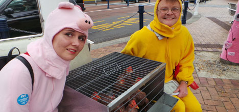 A cage full of plastic chooks accompanied a group of people dressed in animal costumes marking World Vegan Day in the city centre today.