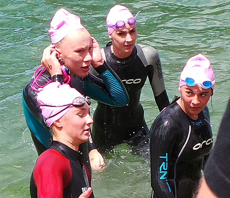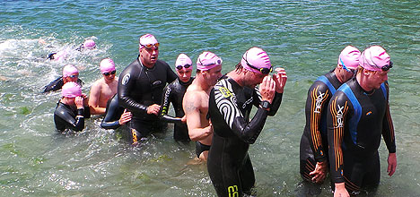 It was a see of pink at people competed in the Bridge to Bridge swim in Tauranga Harbour. Photos: Letitia Atkinson.
