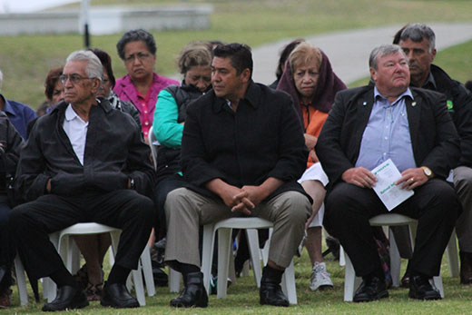 Kaumatua Kihi Ngatai sits with dignitaries at the Waitangi Day dawn service.