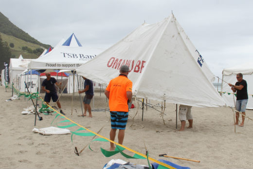 Tents are being erected on Mount Maunganui Beach prior to this weekend's Oceans'14 Surf Life Saving competition.
