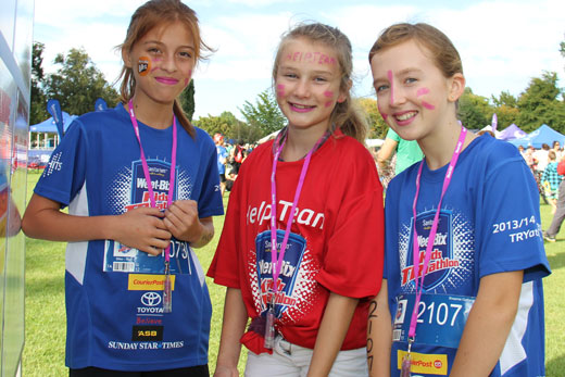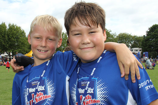 Waiting at the finish line are Olympians and world champion cyclists Alison Shanks, BMX rider Sarah Walker, New Zealand cross triathlon champion Olly Shaw and All Blacks player Liam Messam, who are awarding Weet-Bix Kids triathletes with a medal.