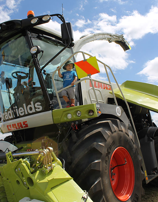 Two-year-old Leyton Voogt of Gordonton, with dad Daniel close by, checked out a CLASS harvester at Grasslandz.