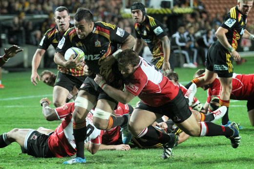 Liam Messam looks to shrug off a tackle during the match against the Lions. Photo: Tracy Hardy.