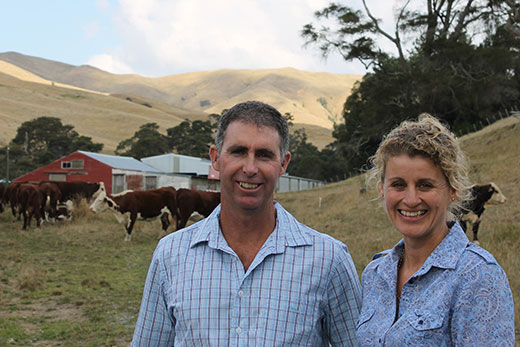 Dean and Lisa Hansen work closely with the Hereford animals they breed at Hukaroa Stud.