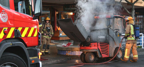Fire fighters at the scene shortly after a roadside rubbish sweeper burst into flames in Mount Maunganui's town centre.