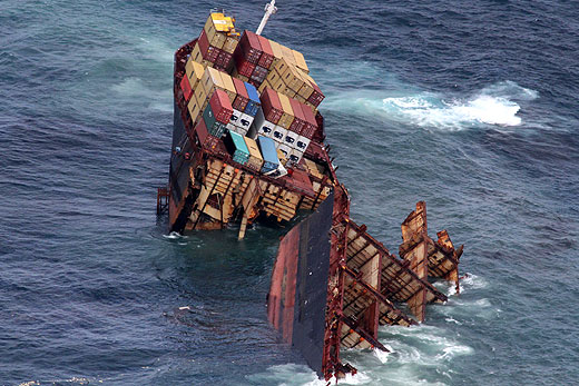The containership Rena struck the Astrolabe Reef, about 25km off the coast of Tauranga, on October 5, 2011. The ship leaked more than 350 tonnes of heavy fuel oil into the environment and broke up, spilling containers and cargo into the ocean, washing up on beaches across the Bay of Plenty.