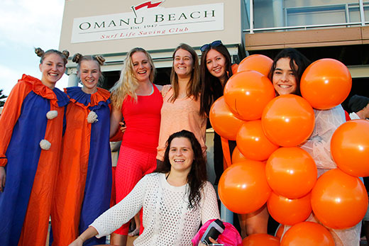 Tauranga Girls' College jesters and Mount Maunganui College students psyching themselves up for the plunge. Photo Bruce Barnard.