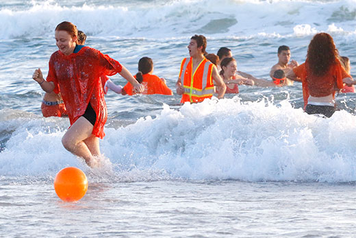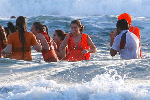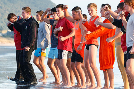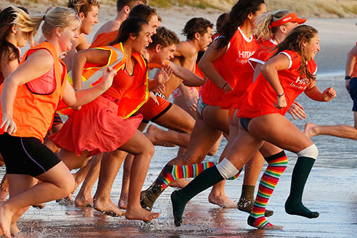 College students make the run into the waters at Omanu Beach this morning. Photos: Bruce Barnard.