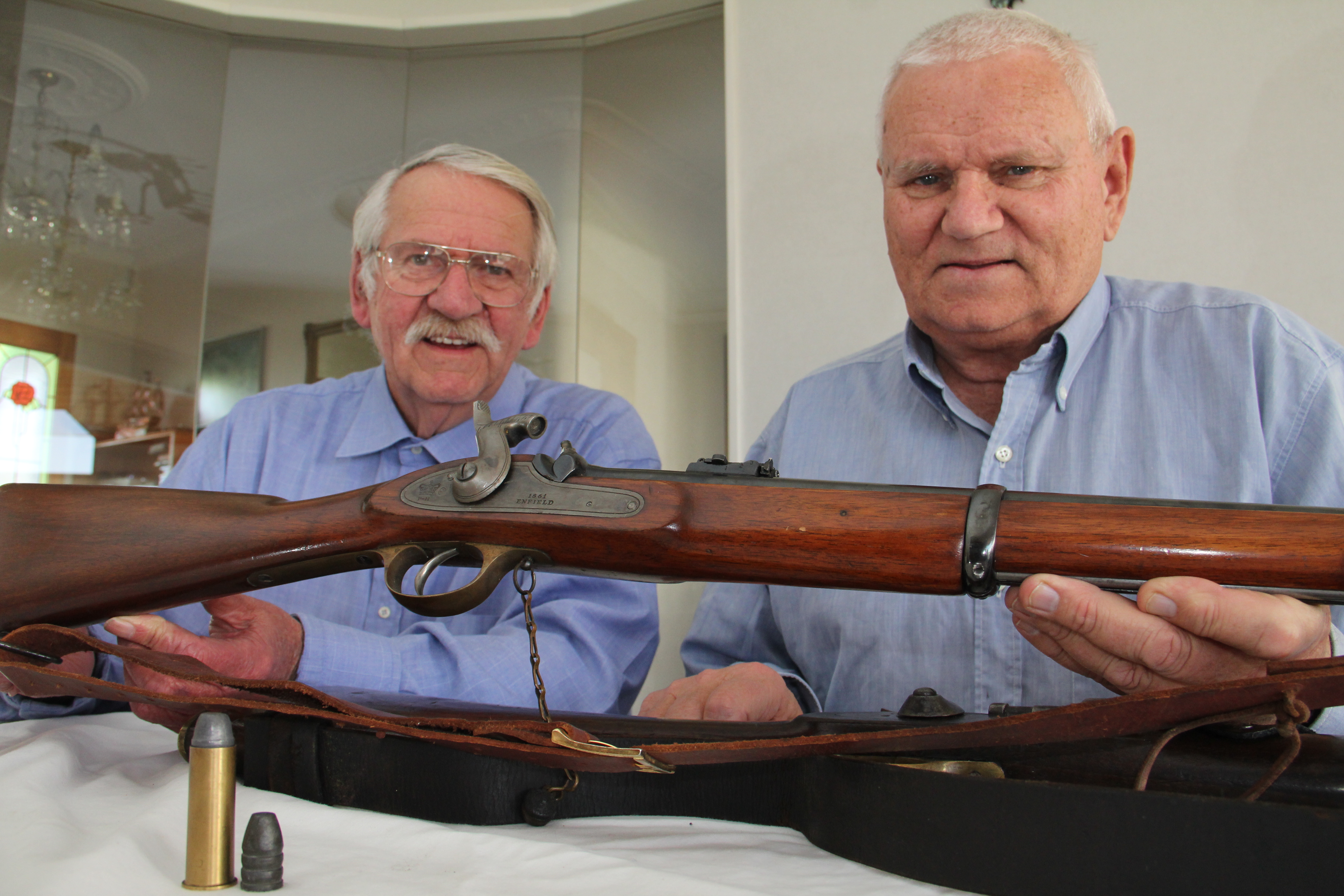 Tauranga Muzzle Loading Gun Club president Andy Duncanson and secretary and event organiser Kevin Hoggins with rifles and bayonets featured at the show. Photo by Tracy Hardy.