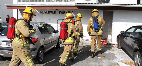 Firemen attending the scene of an afternoon explosion on Devonport Road.