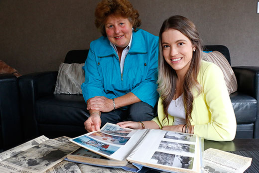Claire Thomasen and her adoptive mother looking at photos and newspaper clippings of her growing up. Photo Bruce Barnard.
