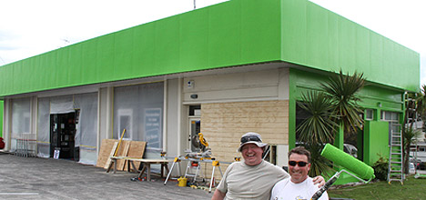 Sean Dorney and Nigel Simpson painting the new Liquorland on Cameron Road.