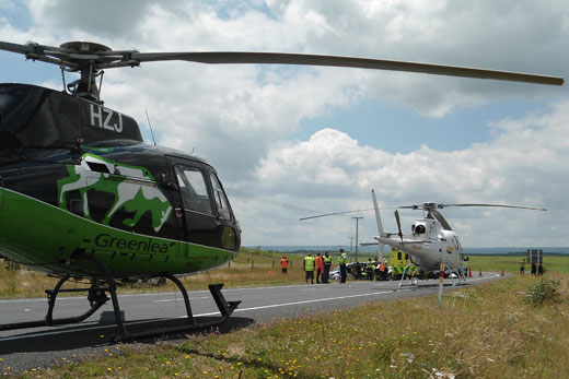 Two people were airlifted to Waikato hospital following the incident, which closed the road for a short period and acted as a landing zone for both helicopters.