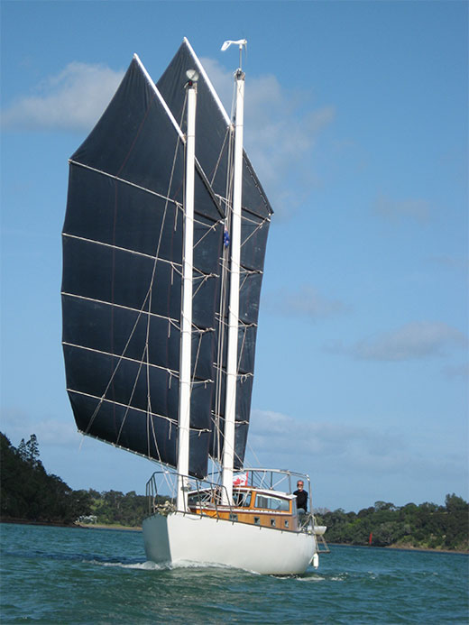 Skipper Kurt Ulmer has made several return voyages from New Zealand to the tropics, and says the junk rigged Mehitabel of Victoria will do everything the standard fore and aft sailing rig can do.