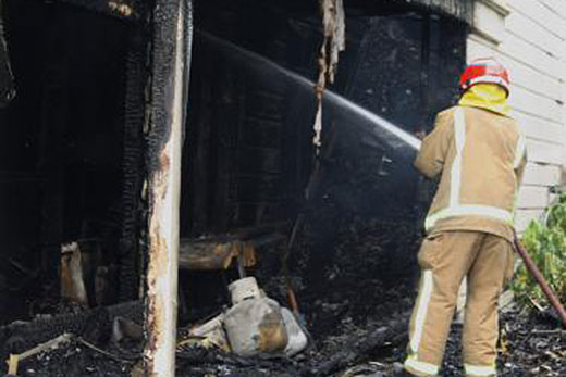 A firefighter dampening down hot spots following the fatal fire.