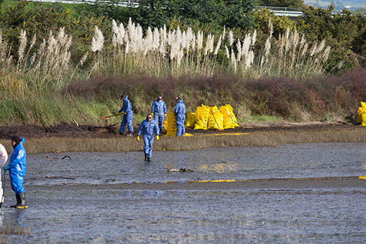 The strong northerly wind that accompanied the oil spill on Monday's incoming tide means most of the heavy fuel oil was blown above the high tide mark.